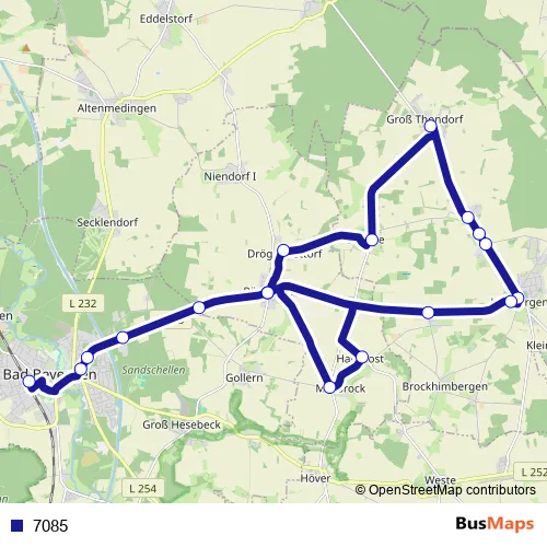 The first stop of the 7085 bus route is Römstedt Ortsmitte and the last stop is