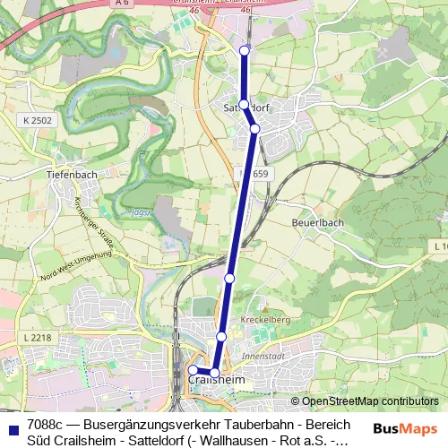 The first stop of the 7088c bus route is Crailsheim Zob and the last stop is Satteldorf Am Bahnhof. 7088c (Busergänzungsverkehr Tauberbahn - Bereich Süd Crailsheim - Satteldorf (- Wallhausen - Rot a.S. - Blaufelden - Schrozberg)) is operational during täglich.
