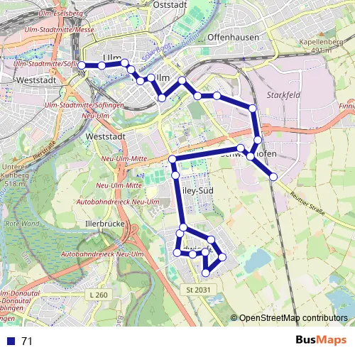 The first stop of the 71 bus route is Ludwigsfeld Ulmer Ried and the last stop is