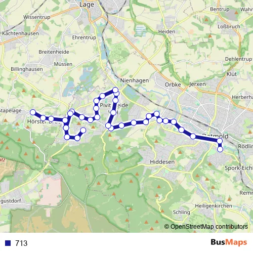 The first stop of the 713 bus route is Detmold, Leopoldinum and the last stop is Lage-Hörste, Markt. 713 is operational during an Werktagen.
