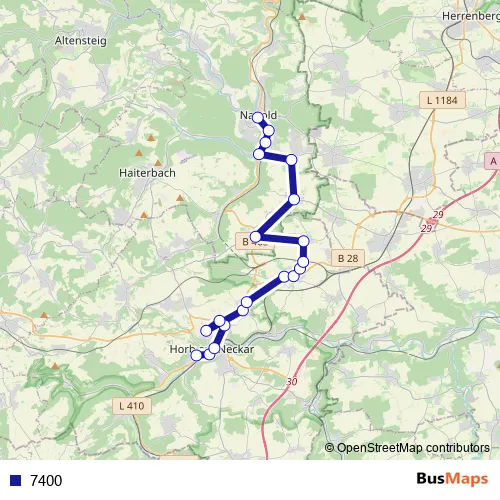 The first stop of the 7400 bus route is Horb Bahnhof/Zob and the last stop is Nagold, Zob. 7400 is operational during täglich.