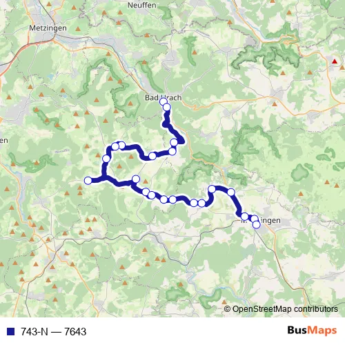 The first stop of the 743-N bus route is Bad Urach, Bahnhof and the last stop is Münsingen Bahnhof. 743-N (7643) is operational during täglich.