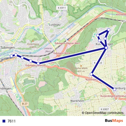 The first stop of the 7611 bus route is Jettenburg Brunnenplatz and the last stop is Tübingen Hauptbahnhof. 7611 is operational during am Wochenende.