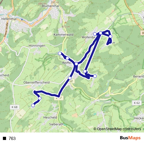 The first stop of the 763 bus route is Hellenthal Reifferscheid Grundschule and the last stop is Hellenthal Hahnenberg. 763 is operational during an Werktagen.