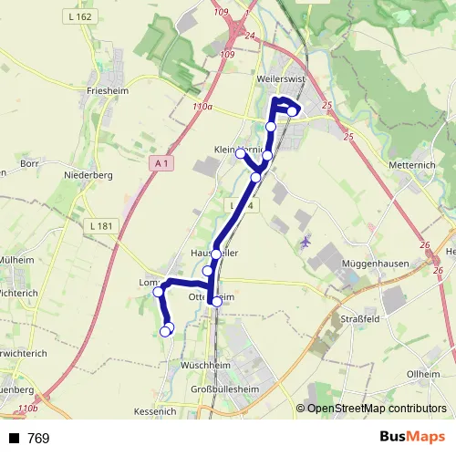 The first stop of the 769 bus route is Weilerswist Lommersum Grundschule and the last stop is Weilerswist Klein Vernich. 769 is operational during an Werktagen.