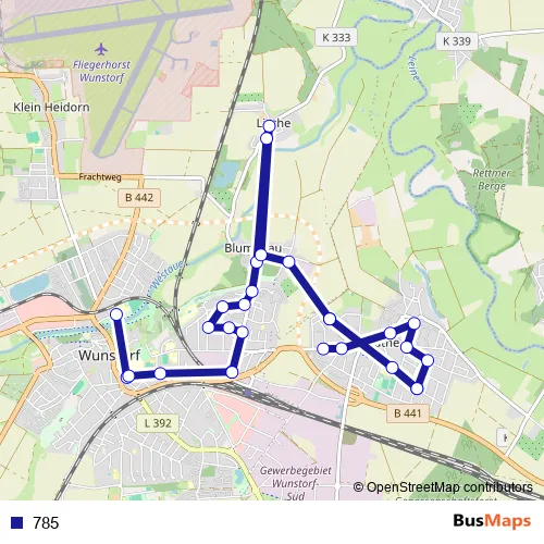The first stop of the 785 bus route is Poggenhagen Fliegerhorst and the last stop is Wunstorf/Zob. 785 is operational during an Werktagen.