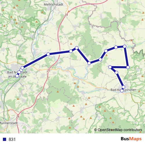 The first stop of the 831 bus route is Bad Neustadt Zob and the last stop is Bad Königshofen, ZOB (5). 831 is operational during an Werktagen.