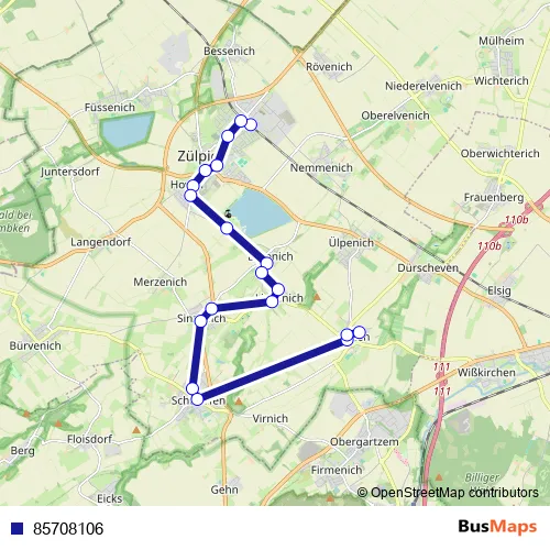 The first stop of the 85708106 bus route is Zülpich Bf and the last stop is Zülpich Enzen Kirche. 85708106 is operational during täglich.