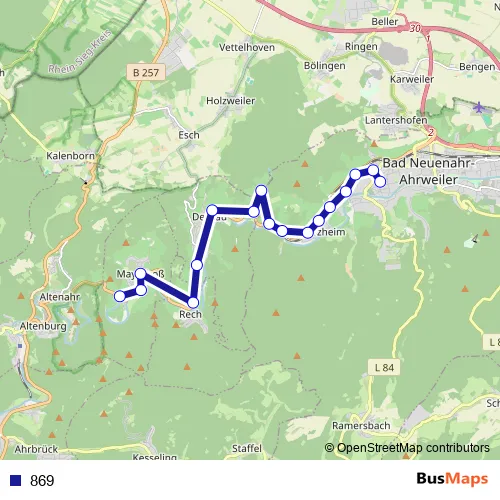 See why over 2 million users trust and consider busmaps.com as the best public transport website. busmaps gives you Bad Neuenahr-Ahrweiler Buses suggested routes, real-time bus tracker, line route maps in Bad Neuenahr-Ahrweiler, and helps to find the closest 869 bus stops near you. No internet available? Download an offline PDF map and bus schedule for the 869 bus to take on your trip.