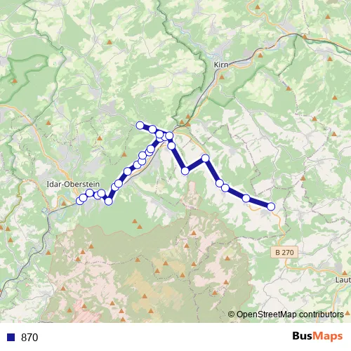 The first stop of the 870 bus route is Idar-Oberstein, Bahnhof and the last stop is Sien, Turnhalle. 870 is operational during täglich.