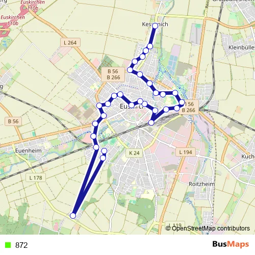 The first stop of the 872 bus route is Euskirchen Kessenich and the last stop is Euskirchen Theodor-Körner-Str.. 872 is operational during täglich.
