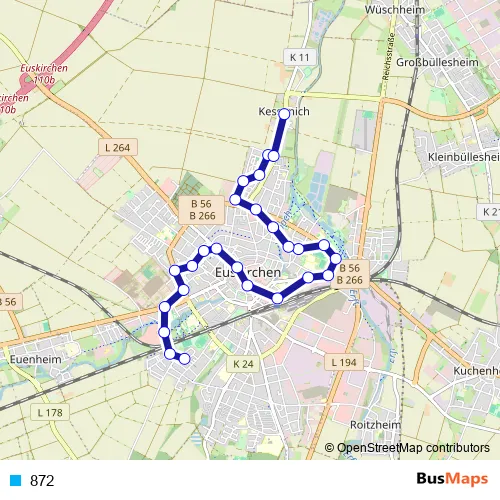 The first stop of the 872 tram route is Euskirchen Theodor-Körner-Str. and the last stop is Euskirchen Kessenich. 872 is operational during täglich.