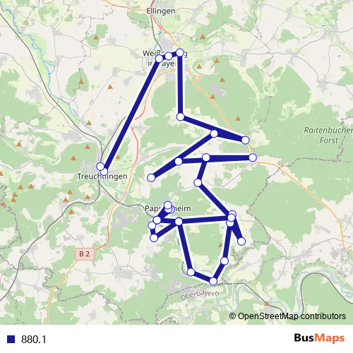 The first stop of the 880.1 bus route is Bieswang Schule and the last stop is Treuchtlingen. 880.1 is operational during täglich.