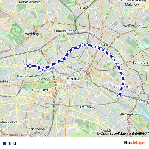 The first stop of the 883 tram route is U Turmstr. (Berlin) and the last stop is S+U Warschauer Str. (Berlin). 883 is operational during täglich.
