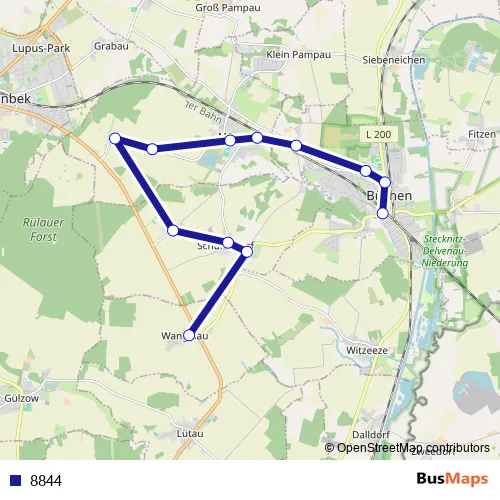 The first stop of the 8844 bus route is Büchen, Schulzentrum, Mast 1=6u and the last stop is Wangelau, Mast 1o. 8844 is operational during an Werktagen.