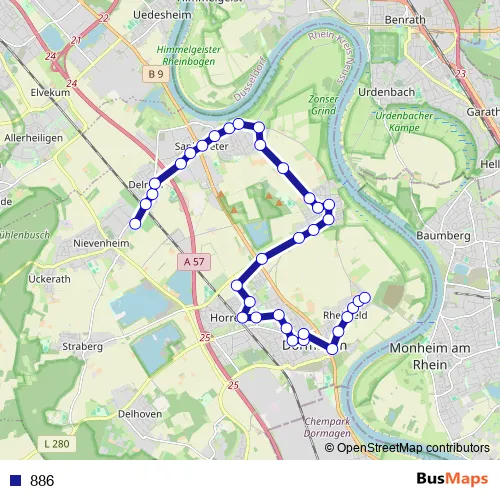 See why over 2 million users trust and consider busmaps.com as the best public transport website. busmaps gives you Duesseldorf Buses suggested routes, real-time bus tracker, line route maps in Duesseldorf, and helps to find the closest 886 bus stops near you. No internet available? Download an offline PDF map and bus schedule for the 886 bus to take on your trip.