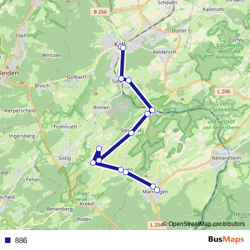 The first stop of the 886 bus route is Kall Rathaus and the last stop is Nettersheim Marmagen Eiffelplatz. 886 is operational during täglich.