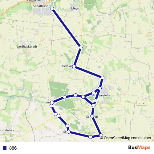 The first stop of the 886 bus route is Lindewitt-Kleinwiehe Hauptstraße and the last stop is Schafflund Schulzentrum. 886 is operational during an Werktagen.