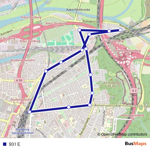 The first stop of the 931 E bus route is Duisburg Duissern U-Bf and the last stop is Duisburg Duissern U-Bf. 931 E is operational during an Werktagen.