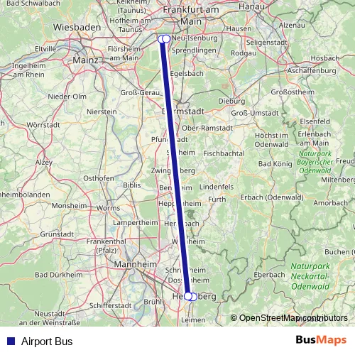 The first stop of the Airport Bus bus route is Heidelberg, NH Collection Ho. and the last stop is Frankfurt (Main) Flughafen Terminal 2. Airport Bus is operational during täglich.