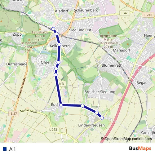 The first stop of the Al1 metro route is Alsdorf, Annapark Bahnhof (Bus) and the last stop is Würselen, Broichweiden Neusen Kreuz. Al1 is operational during an Werktagen.