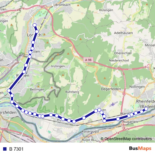 Gretherstraße - Bahnhofsplatz - Basler Straße - Lörracherstrasse - Baselstrasse - Rauracherstrasse - Hörnle - Basler Straße - Markgrafenstraße - Jaspersstraße - Lörracher Straße - Rheinfelder Straße - Hauptstraße - Bahnhofstraße - Gewerbestraße - Warmbacher Straße - Furtweg - Warmbacher Straße - Bahnhofplatz