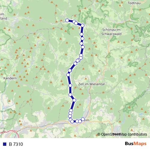 The first stop of the B 7310 bus route is Neuenweg (Kr LÖ), Haldenhof and the last stop is Schopfheim, Ebertschule. B 7310 is operational during an Werktagen.