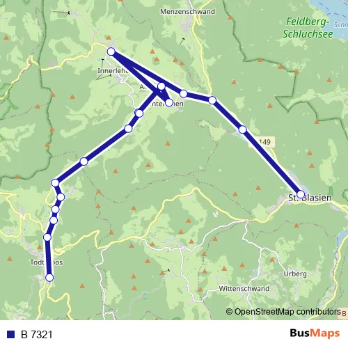 The first stop of the B 7321 bus route is St. Blasien, Busbahnhof and the last stop is Todtmoos, Schule. B 7321 is operational during an Werktagen.