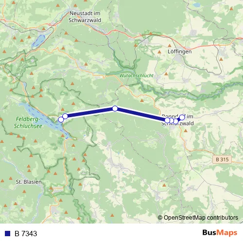 The first stop of the B 7343 bus route is Bonndorf, Abzw. Boll and the last stop is Schluchsee, Rathaus. B 7343 is operational during täglich.