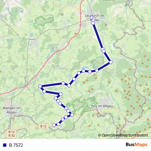 The first stop of the B 7572 bus route is Leutkirch, Bahnhof and the last stop is Argenbühl, Eglofs. B 7572 is operational during an Werktagen.