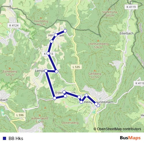 The first stop of the BB Hks bus route is Hilsenhain, Dell and the last stop is Heiligkreuzsteinach, Schule. BB Hks is operational during täglich.