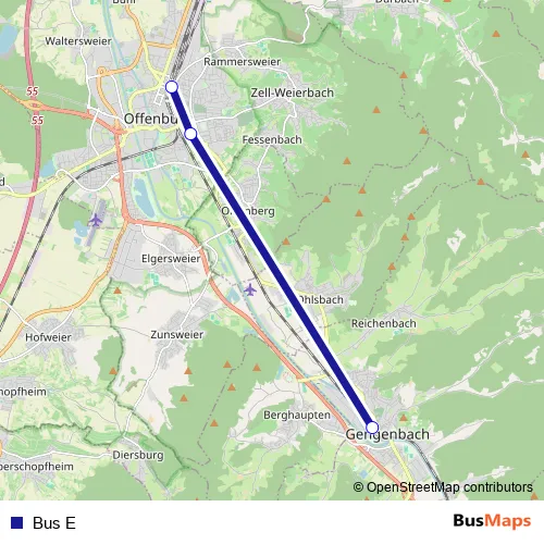 The first stop of the Bus E bus route is Bahnhof-Ost, Offenburg and the last stop is Bahnhof, Gengenbach. Bus E is operational during täglich.