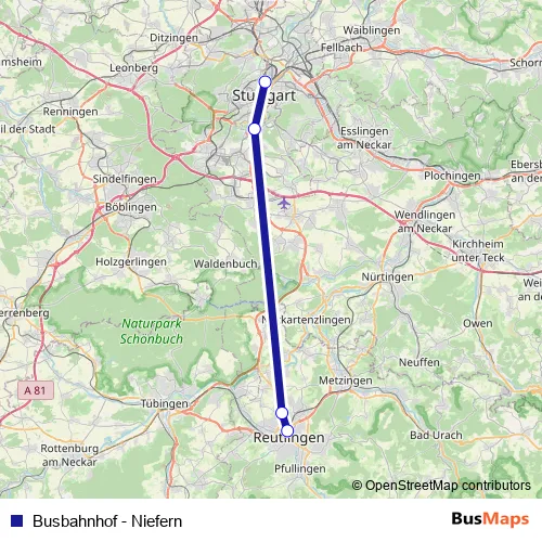 The first stop of the Busbahnhof - Niefern rail route is Reutlingen Hauptbahnhof and the last stop is Hauptbf (Pariser Platz). Busbahnhof - Niefern (Busbahnhof - Niefern) is operational during täglich.