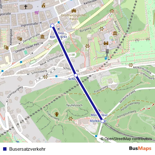 The first stop of the Busersatzverkehr bus route is Heidelberg, Molkenkur and the last stop is Heidelberg, Rathaus/Bergbahn. Busersatzverkehr (Busersatzverkehr) is operational during täglich.