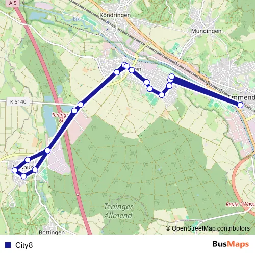 The first stop of the City8 bus route is Emmend. Bahnhof/Musikschule and the last stop is Emmend. Bahnhof/Musikschule. City8 is operational during täglich.