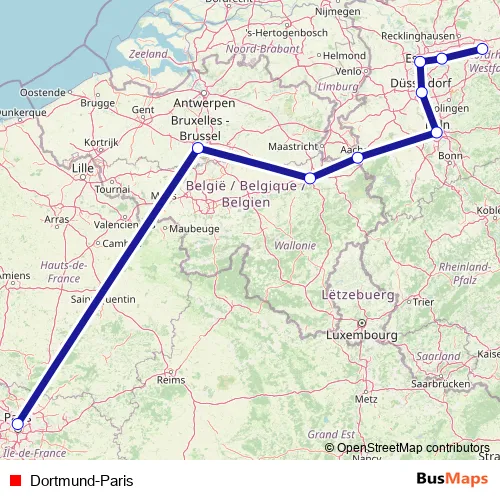 The first stop of the Dortmund-Paris rail route is Dortmund Hbf and the last stop is Paris Gare du Nord. Dortmund-Paris is operational during täglich.
