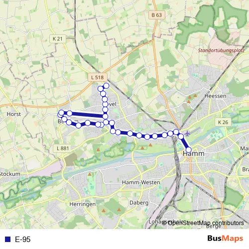 The first stop of the E-95 bus route is Hamm, Nordstraße and the last stop is Hamm, Uhlenfeld Wendeplatz. E-95 is operational during an Werktagen.