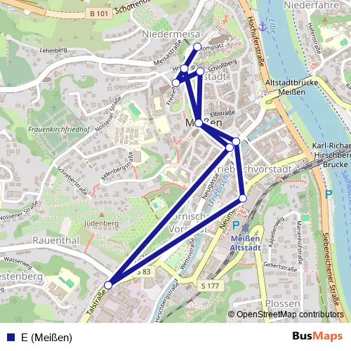 See why over 2 million users trust and consider busmaps.com as the best public transport website. busmaps gives you Meissen Buses suggested routes, real-time bus tracker, line route maps in Meissen, and helps to find the closest E (Meißen) bus stops near you. No internet available? Download an offline PDF map and bus schedule for the E (Meißen) bus to take on your trip.