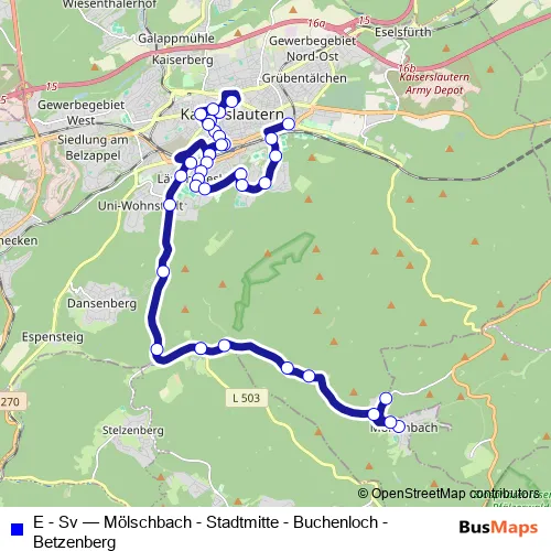 The first stop of the E - Sv bus route is Mölschbach, Johanniskreuzerstr and the last stop is Kaiserslautern, Wasserwerk. E - Sv (Mölschbach - Stadtmitte - Buchenloch - Betzenberg) is operational during an Werktagen.