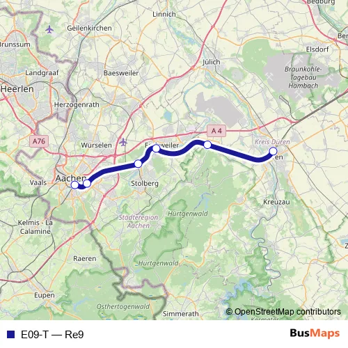 See why over 2 million users trust and consider busmaps.com as the best public transport website. busmaps gives you Aachen Rail Services suggested routes, real-time bus tracker, line route maps in Aachen, and helps to find the closest E09-T rail stops near you. No internet available? Download an offline PDF map and bus schedule for the E09-T rail to take on your trip.