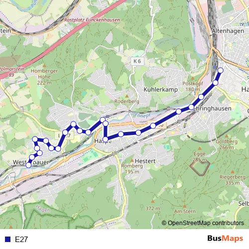 See why over 2 million users trust and consider busmaps.com as the best public transport website. busmaps gives you Hagen Buses suggested routes, real-time bus tracker, line route maps in Hagen, and helps to find the closest E27 bus stops near you. No internet available? Download an offline PDF map and bus schedule for the E27 bus to take on your trip.