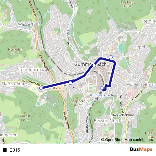 See why over 2 million users trust and consider busmaps.com as the best public transport website. busmaps gives you Gummersbach Buses suggested routes, real-time bus tracker, line route maps in Gummersbach, and helps to find the closest E316 bus stops near you. No internet available? Download an offline PDF map and bus schedule for the E316 bus to take on your trip.