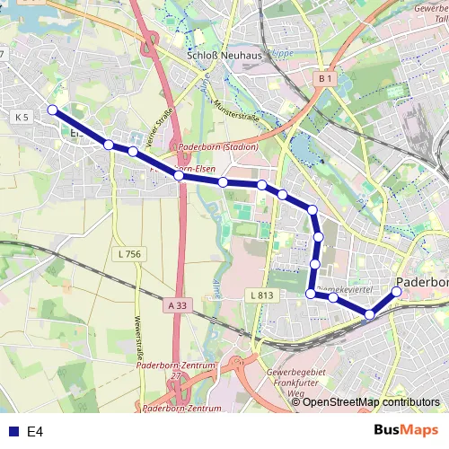See why over 2 million users trust and consider busmaps.com as the best public transport website. busmaps gives you Paderborn Buses suggested routes, real-time bus tracker, line route maps in Paderborn, and helps to find the closest E4 bus stops near you. No internet available? Download an offline PDF map and bus schedule for the E4 bus to take on your trip.