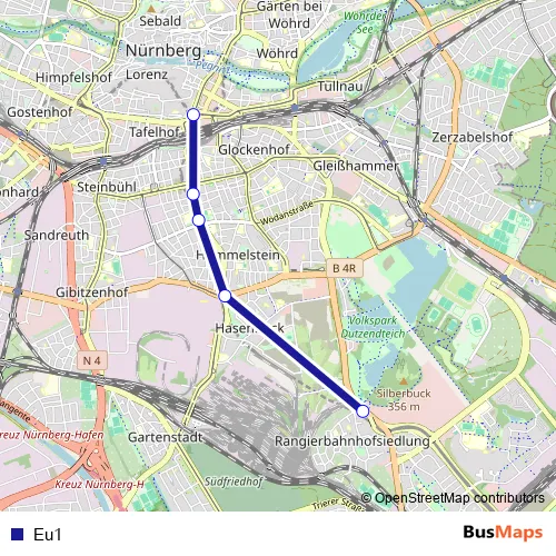 The first stop of the Eu1 bus route is Nürnberg Hauptbahnhof and the last stop is Nürnberg Bauernfeindstr.. Eu1 is operational during an Werktagen.