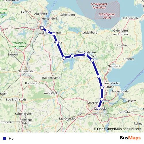 The first stop of the Ev rail route is Kiel Hbf/Kaistraße and the last stop is Plön ZOB/Bahnhof. Ev is operational during täglich.