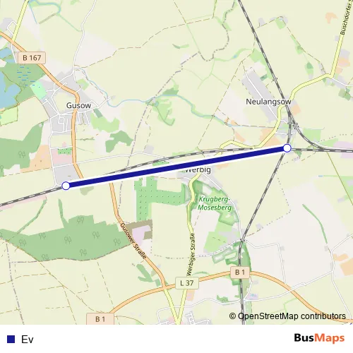 The first stop of the Ev rail route is Werbig (MOL), Bahnhof and the last stop is