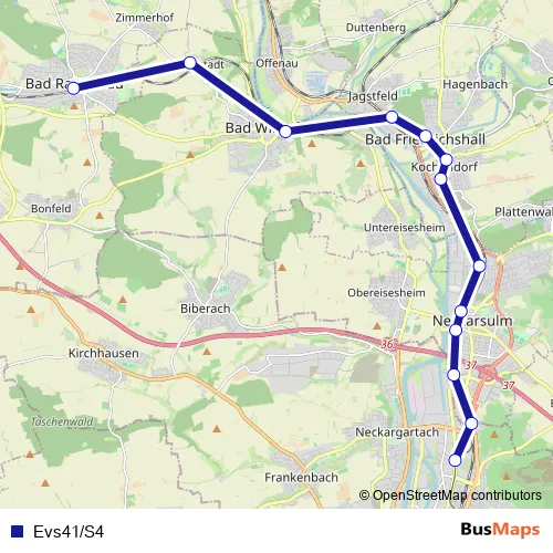 See why over 2 million users trust and consider busmaps.com as the best public transport website. busmaps gives you Heilbronn Buses suggested routes, real-time bus tracker, line route maps in Heilbronn, and helps to find the closest Evs41/S4 bus stops near you. No internet available? Download an offline PDF map and bus schedule for the Evs41/S4 bus to take on your trip.