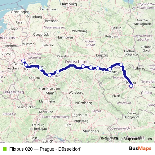 The first stop of the Flixbus 020 bus route is Düsseldorf central bus station and the last stop is Prague (Central Bus Station Florenc). Flixbus 020 (Prague - Düsseldorf) is operational during täglich.