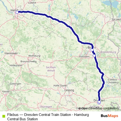 The first stop of the Flixbus bus route is Dresden Bayrische Strasse and the last stop is Hamburg Central Bus Station. Flixbus (Dresden Central Train Station - Hamburg Central Bus Station) is operational during täglich.