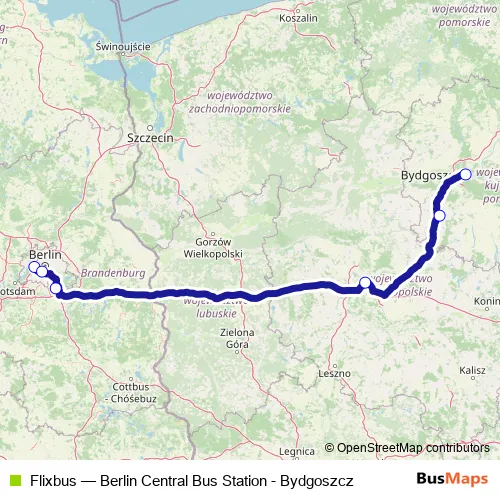 The first stop of the Flixbus bus route is Berlin Central Bus Station and the last stop is Bydgoszcz Bus station. Flixbus (Berlin Central Bus Station - Bydgoszcz) is operational during täglich.